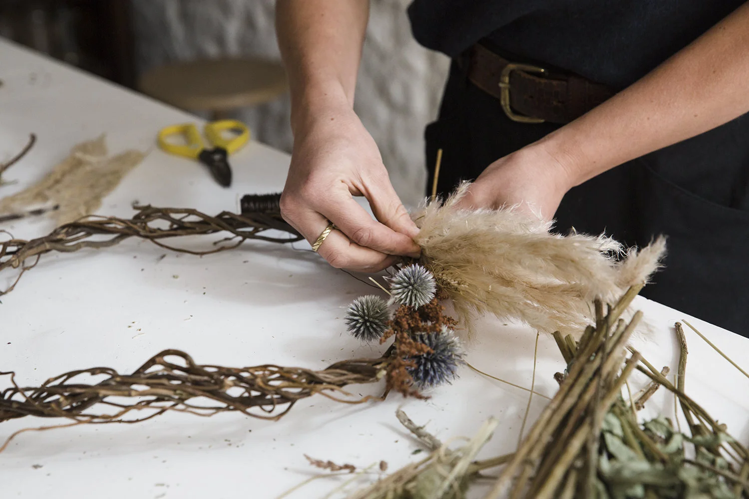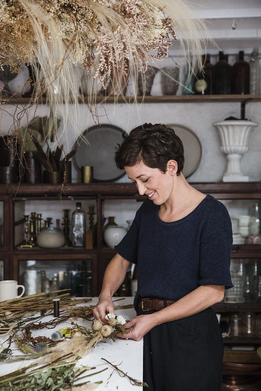 ‘Debs works in a beautifully converted outhouse in her garden in Bruton. Her studio is a treasure trove of materials she uses for her floral installations and plant styling commissions. Vases, vessels, urns, candle holders, dried and fresh florals, it was a feast for the eyes! ‘
